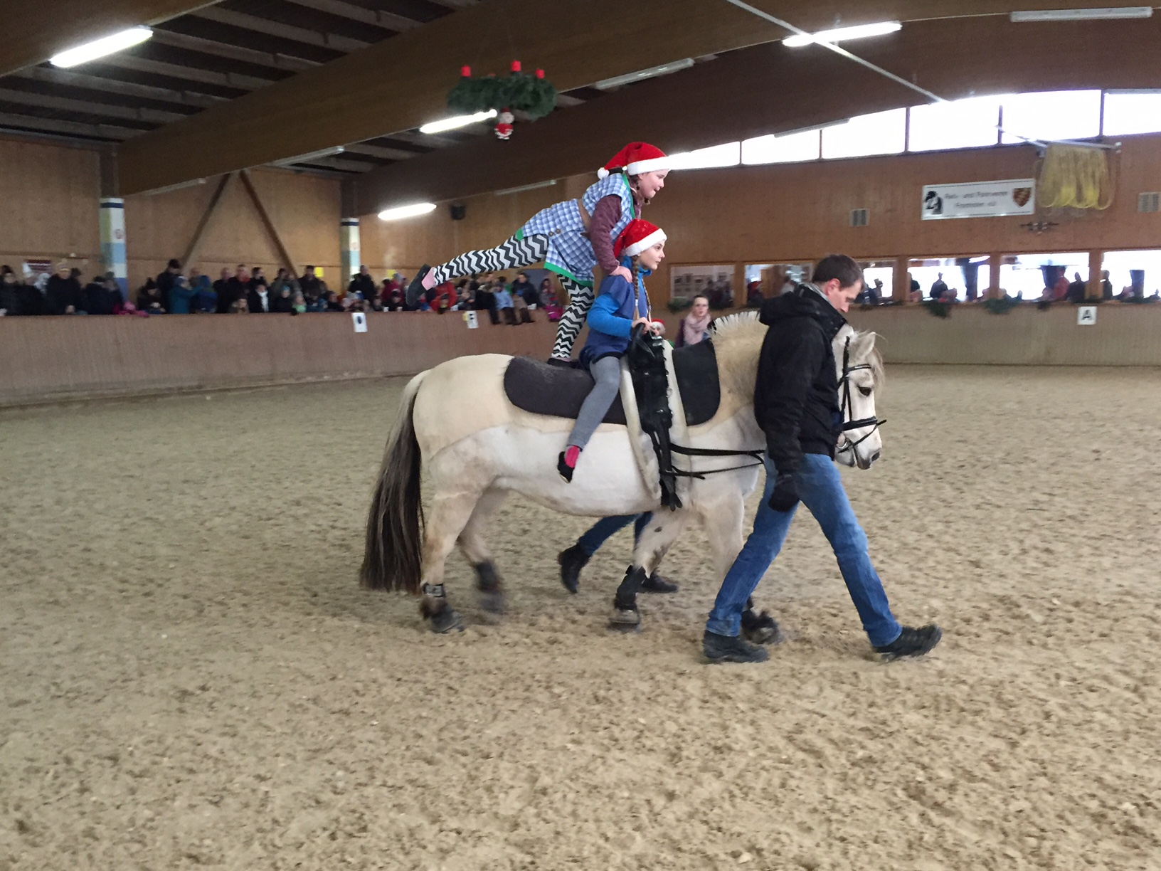 Im Anschluss daran zeigte eine weitere Nachwuchsvoltigiergruppe als Weihnachtswichtel, Pinguine, Tannenbäume und Engel verkleidet, was in den wöchentlichen Trainingsstunden mit dem Pferd Smoky und den Trainern Carina und Daniel Zembrot geübt wird.